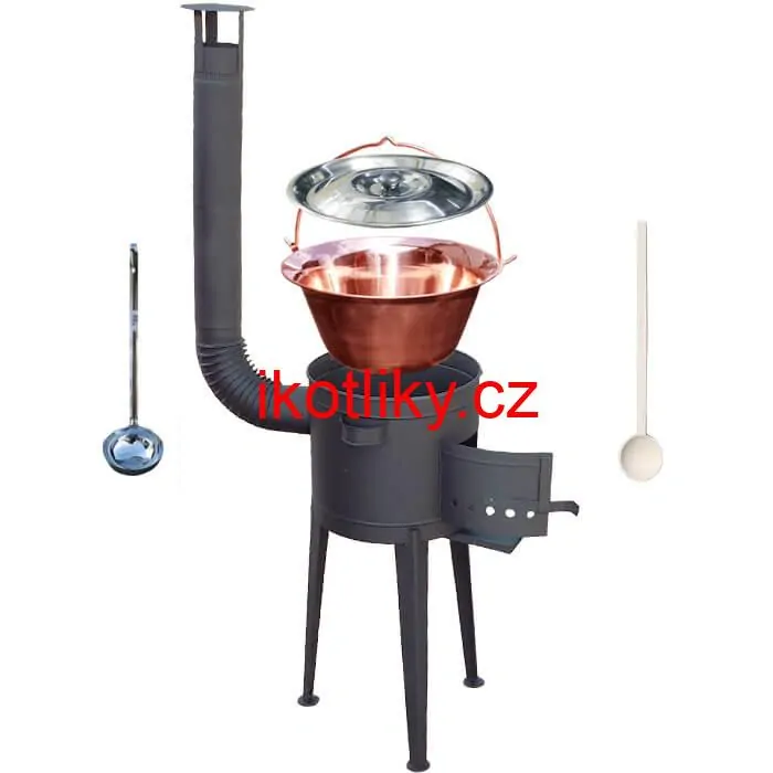 Kotlina obsahuje vysoké nožičky. Tloušťka kotliny je až 1,5 mm! Při kotlině můžete sedět nebo stát a pohodlně budete míchat, přidávat ingredience do kotlíku. Při vybírání kotlíku se nemusíte ohýbat (nebude Vás bolet záda).