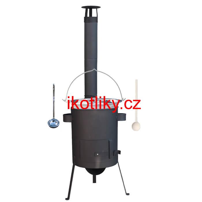 Kotlíková souprava pro outdorové vaření guláše a rybích polévek v přírodě, v zahradě nebo v otevřené kuchyně, především pro chalupáře, chataře, do kempu a na táboření.