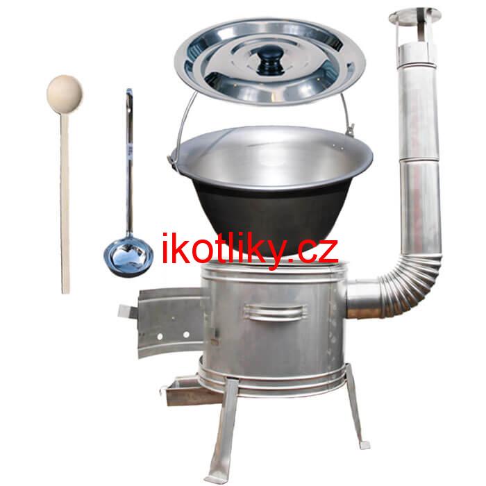 Kotlíková souprava na outdorové vaření guláše a rybích polévek v přírodě, v zahradě nebo v otevřené kuchyně, především pro chalupáře, chataře, do kempu a na táboření.