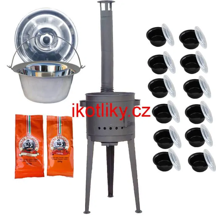 Kotlíková souprava pro vaření guláše a jiných pochutin v zahradě, v přírodě pro rodiny, různé společenské akce a posezení při dobrém gulášu. U této kotlíkové soupravy bude požitek vařit guláš v zahradě nebo v přírodě. Kotlina obsahuje vysoké nožičky. Tloušťka kotliny je až 1,5 mm!